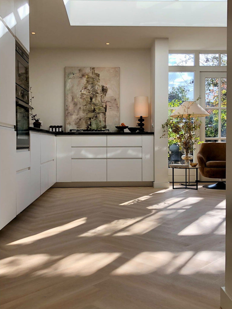 Durch das großzügige Dielenformat wird der Raum optisch erweitert. Das Floer Walfischgrät Klickvinyl bietet echte Premium-Optik, ohne auf die praktischen Vorteile eines pflegeleichten Vinylbodens zu verzichten.